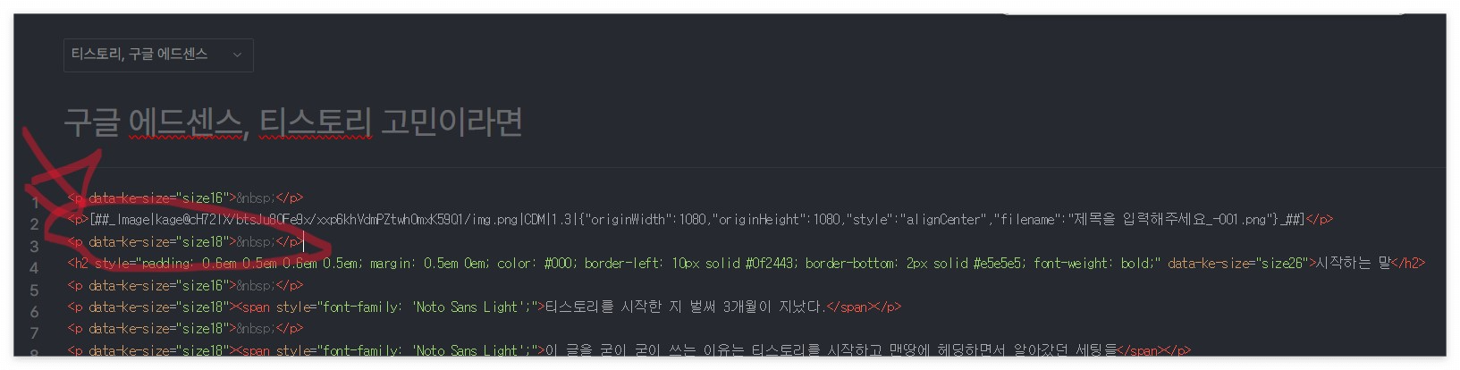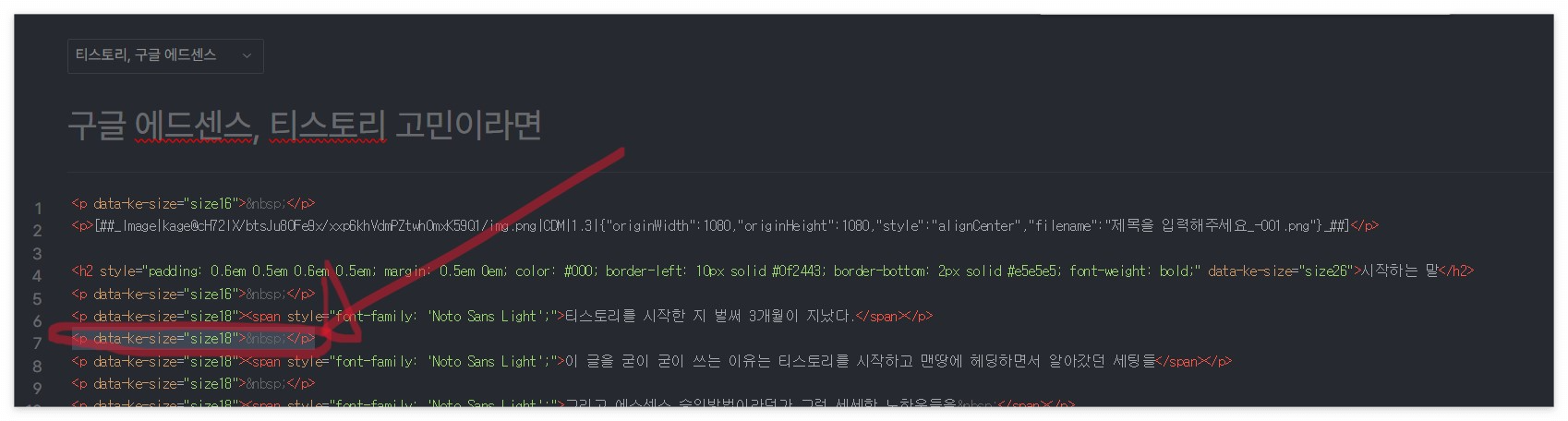⑧ 중간중간에 보이는 <p data-ke-size="size18"> </p> 을 복사하여