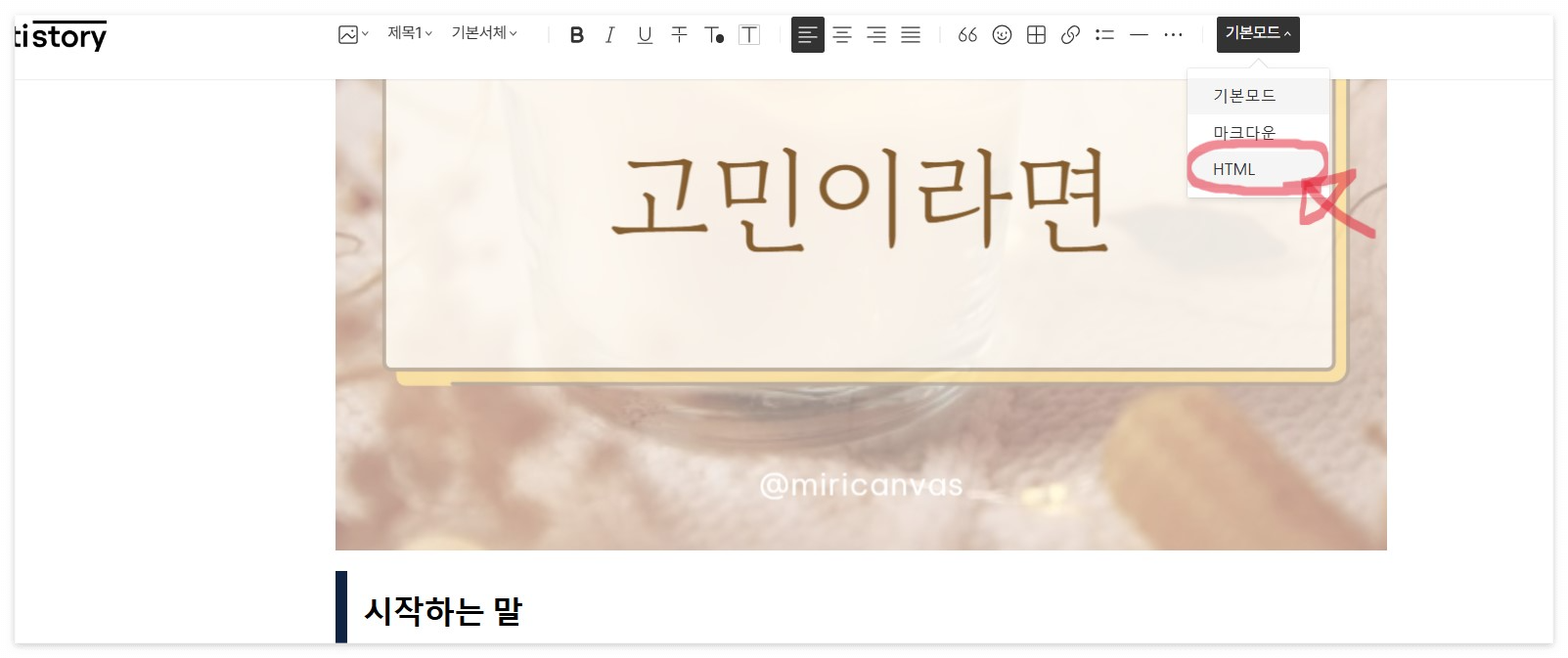 ③ 그런 다음 모드를 기본모드에서 HTML로 전환한다.