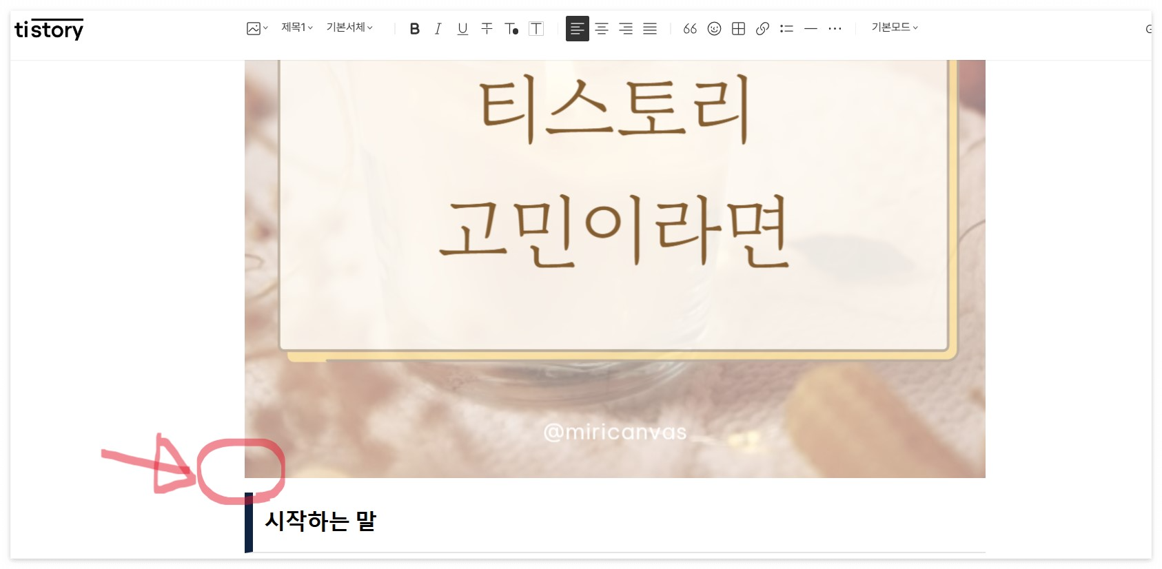 ⑩ 다시 기본모드로 변경하면 이미지와 소제목 사이에 공간이 생긴 걸 확인할 수 있다.