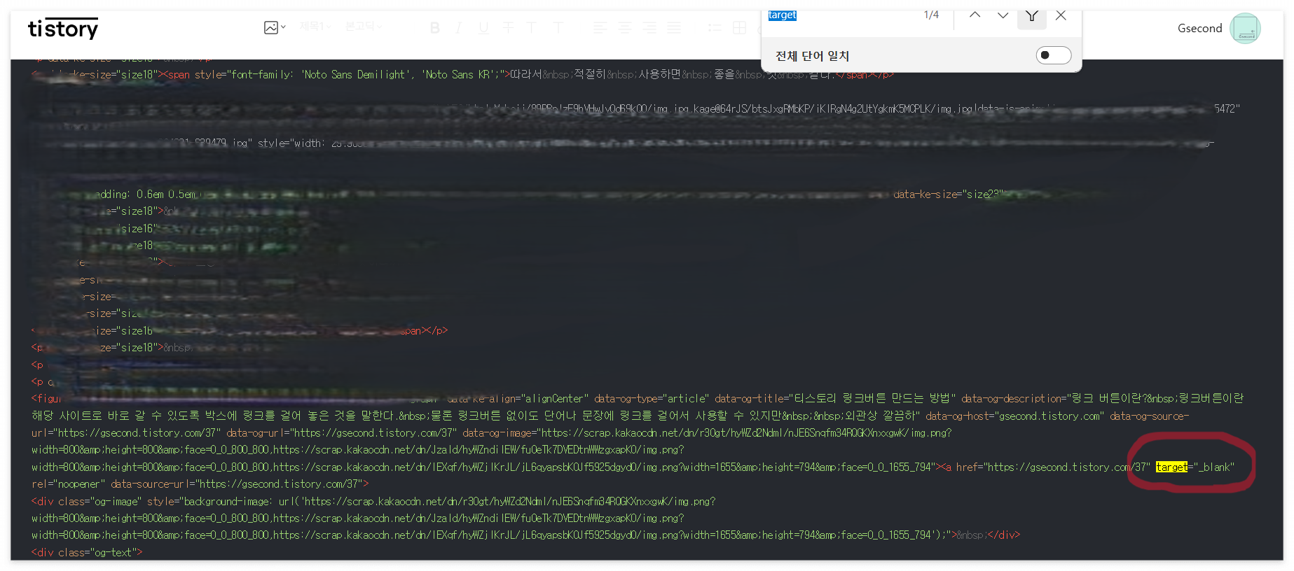 ① HTML 모드에서 Ctrl + F를 누르고 'target'을 입력하여 검색합니다.