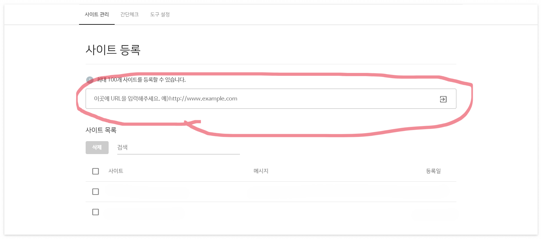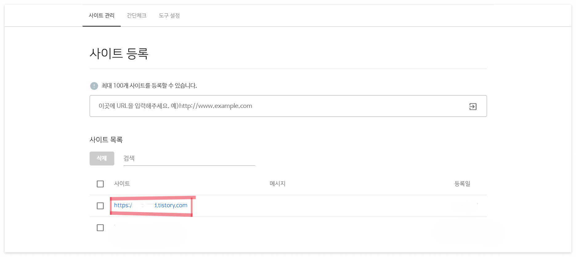 사이트 등록에 본인의 블로그 주소를 입력한다.