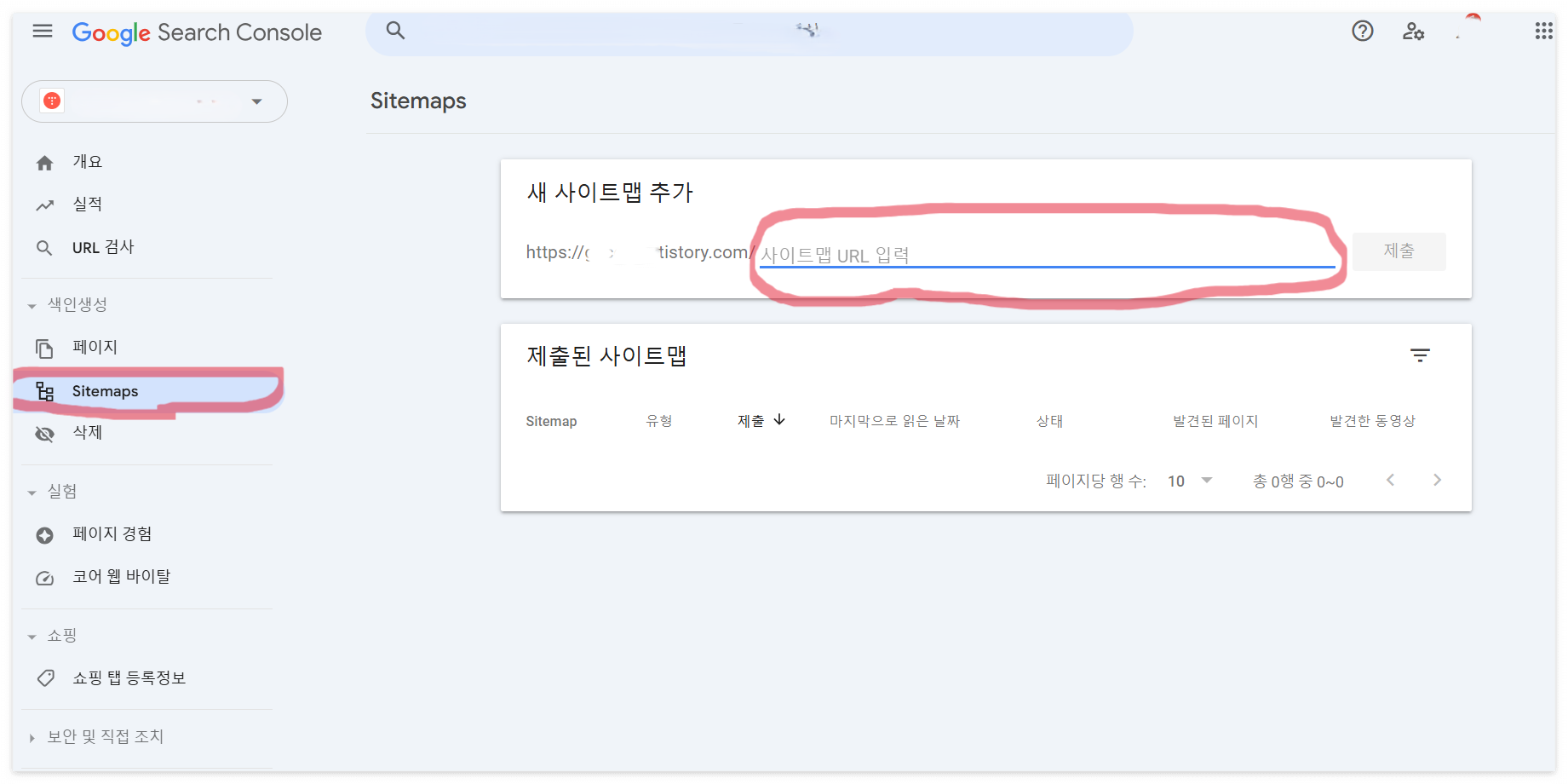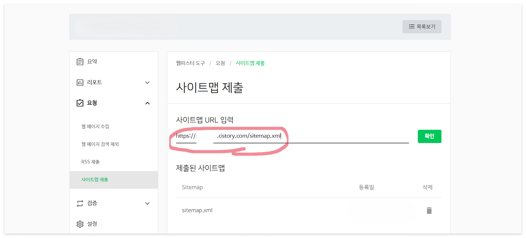 사이트맵도 아까와 같은 방식으로 본인 블로그 주소 입력하고 뒤에 /sitemap.xml을 입력하면 된다.