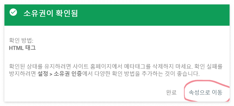 사이트 소유 확인 화면으로 넘어가서 소유확인을 하면 아래와 같은 메시지가 뜰 것이다.