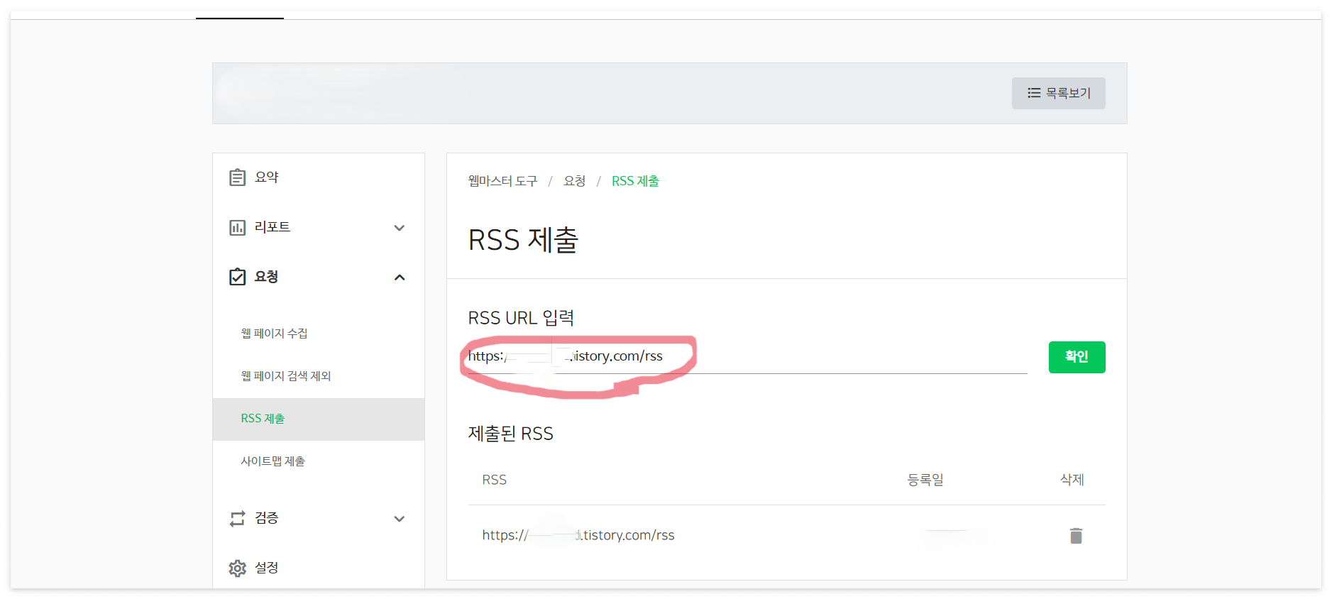 요청 항목에서 RSS제출, 사이트맵 제출을 손보면 된다.