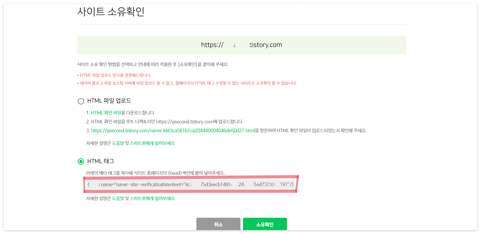 다음은 본인의 블로그가 맞는지 소유권 확인하는 과정이다.